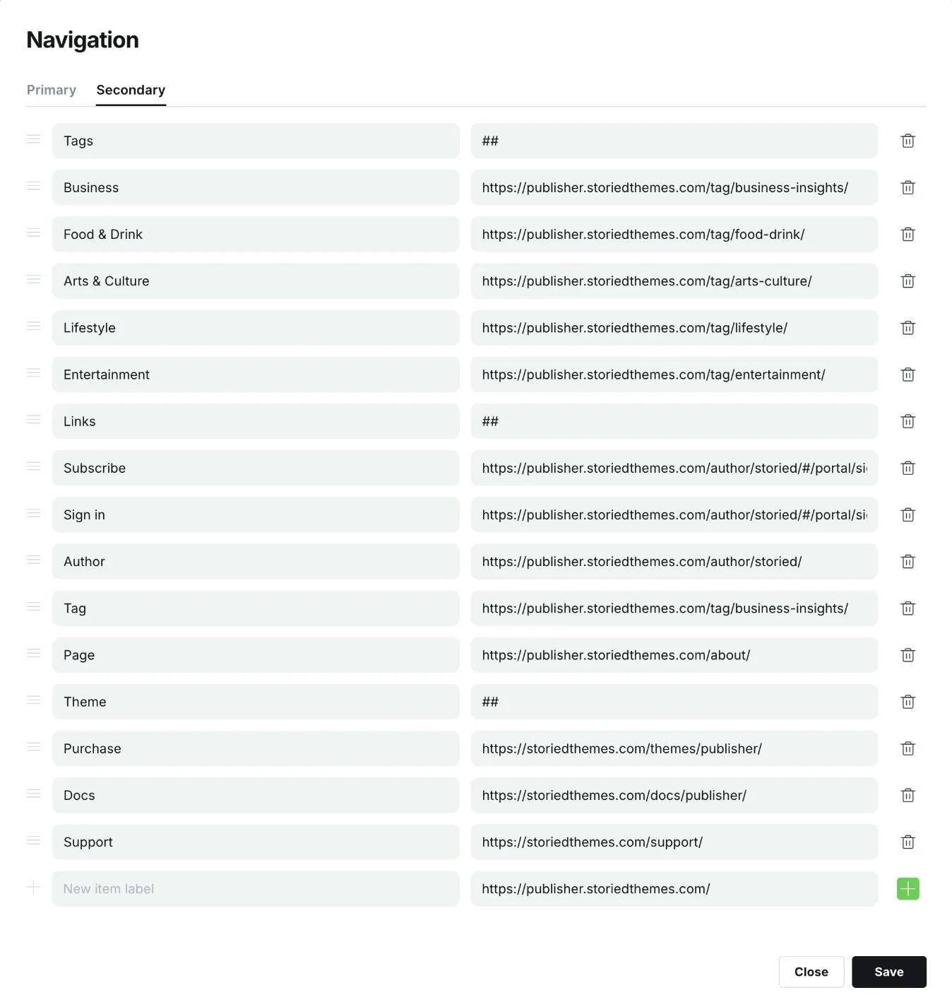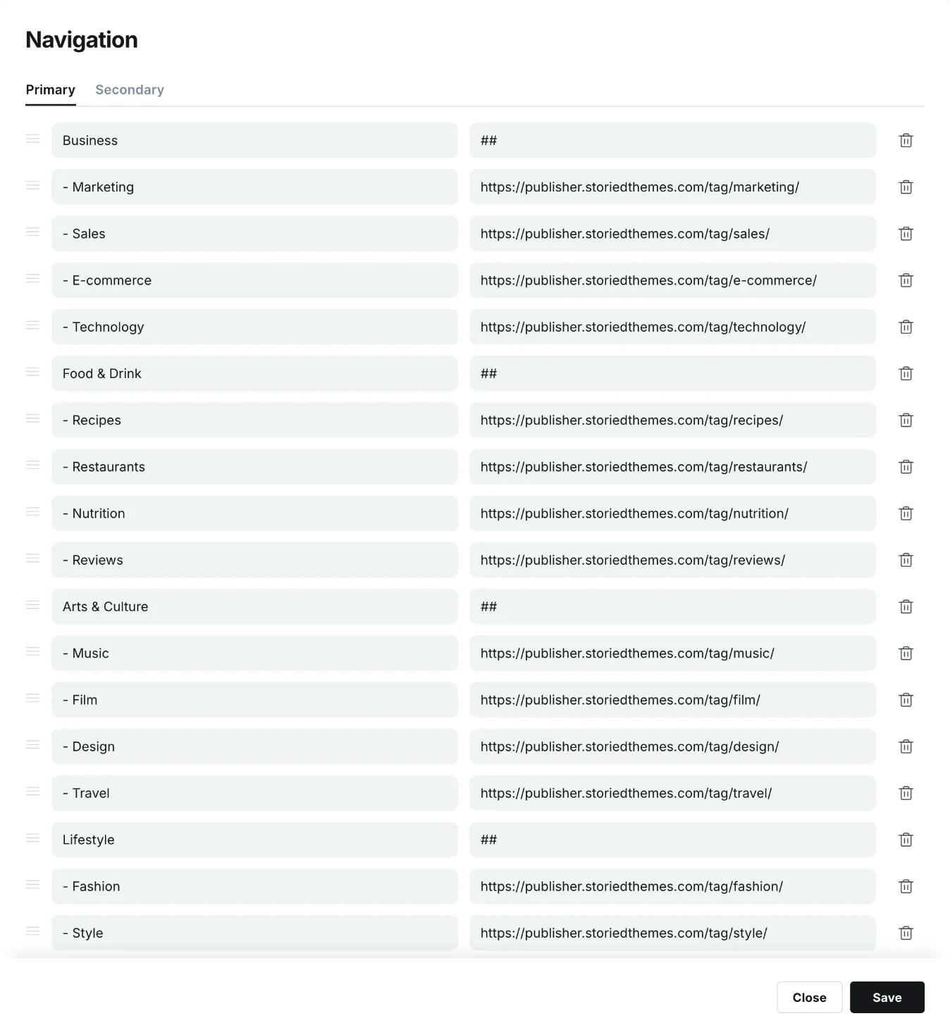 By default, the primary navigation appears as a one level stacked menu in the fly-out menu. To create dropdowns, add a new navigation item where you'd like the dropdown to begin and type ## in the URL field. This tells the theme when to start a dropdown. Then to add submenu items to the dropdown, prefix the items below it with -. Note: If you do not prefix an item below, it will end the dropdown. See example below: